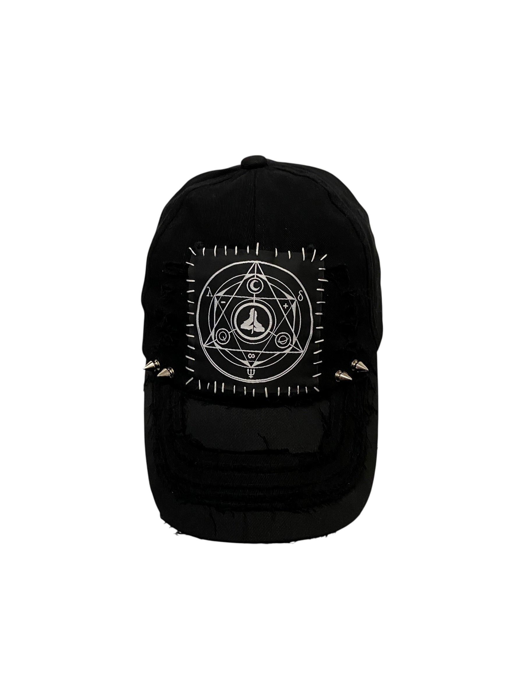 Dad cap distressed with spikes and lepragram patch.